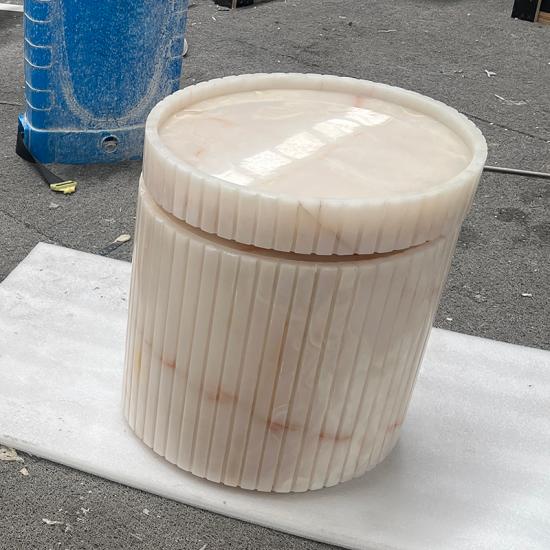 Esta lujosa mesa de centro redonda de mármol presenta detalles estriados verticales uniformes, mecanizados con precisión a lo largo de todo el cuerpo cilíndrico, con una superficie redonda plana que encaja a la perfección y bordes redondeados y suaves, todo pulido hasta obtener un acabado brillante similar al de un espejo que realza la profundidad y la belleza natural de la piedra de ónix.