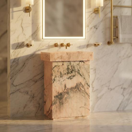 Es una piedra natural elegante y singular, con una delicada base rosa pálido entretejida con llamativas vetas gris oscuro y negras, y sutiles toques de rojo cálido y burdeos en sus patrones naturales. La encimera y el cuerpo del mueble son de la misma materia prima, logrando una conexión continua y perfecta de texturas naturales en toda su extensión, maximizando la belleza artística de la piedra natural. La estructura integrada de mármol elimina por completo los problemas de los muebles de madera tradicionales, como el moho, la deformación y el agrietamiento. Es impermeable y resistente a la humedad, y soporta sin problemas el ambiente húmedo del baño. Su vida útil supera con creces la de los muebles de baño convencionales.