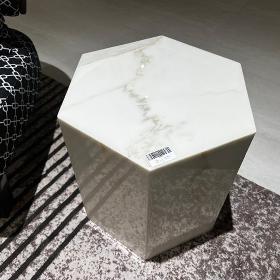 Mesa auxiliar de mármol blanco con forma de vientre de pez natural. Diseño hexagonal sencillo, pulido de alto brillo, con vetas doradas claras únicas. Perfecto como mesa auxiliar, mesita de noche o mesa decorativa de piedra. Este es un mármol blanco clásico de alta gama fabricado en China. Sus principales características son su color blanco puro y sus delicados patrones dorados claros. Es una piedra popular para estilos de diseño minimalistas y de lujo sutil de inspiración italiana, y su relación calidad-precio es mucho mejor que la del mármol blanco puro importado de Italia.